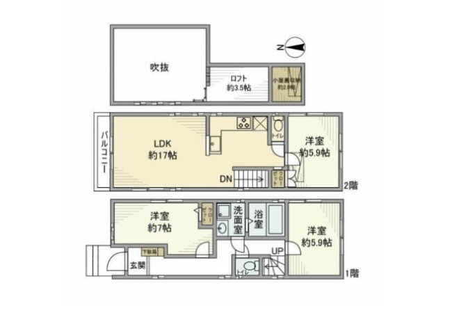 2階の洋室の上には約9.7帖の広々としたロフトがあり、季節ものや趣味の道具などをたっぷりと収納できます。