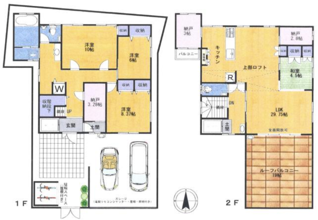 屋根とシャッターが付いた駐車場が2台分確保されており、大切なお車を雨風から守ります。
