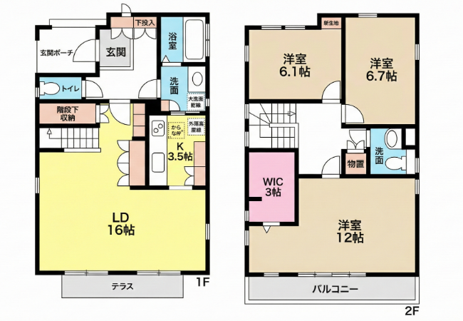 1階には約16帖のリビングダイニングと3.5帖のキッチンを配置。