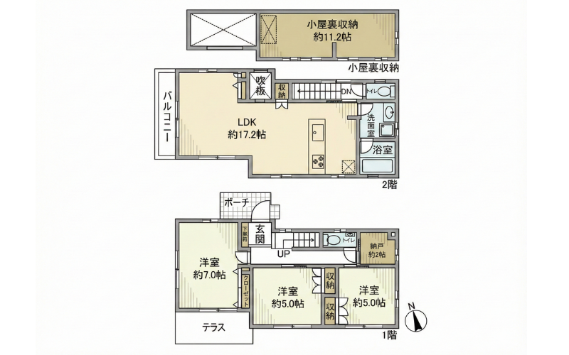 この物件の最大の特徴は、驚くべき収納力です。2階の上部には約11.2帖もの広大な小屋裏収納(グルニエ)があり、季節外の衣類や趣味の道具、大きな荷物もすっきりと収納可能。