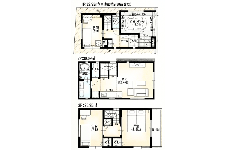 85.99㎡の専有面積を活かした3階建ての3LDK。1階に約6.4帖、3階に約5.0帖の洋室2部屋を配置しており、寝室や子供部屋、書斎など用途に合わせて使い分けられます。