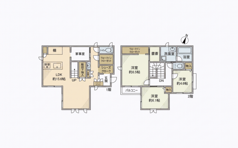 1階に配置されたLDKは約15.6帖の広さがあり、南東向きのため明るい日差しが差し込みます。